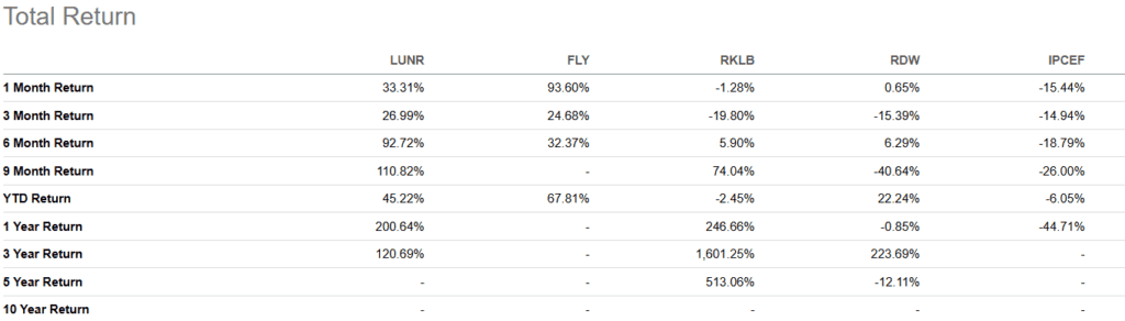 Pár z těchto titulů patří k absolutní špičce sektoru. Širší vesmírné ETF Procure Space (UFO) vykazuje za poslední rok zhodnocení 103,79 %, přičemž právě Rocket Lab (RKLB) s vahou 4,5 % a LUNR s vahou přes 3,5 % patří mezi jeho hlavní tahouny. Samotné RKLB za poslední tři roky připsalo 1 601,25 %. LUNR s ročním výnosem 200,64 % a devítiměsíčním růstem o 110,82 % výrazně překonává průměr trhu. Na druhé straně Japonská ispace (meziročně -44,71 %) a Firefly (YTD 67,81 %) jsou na burze relativně krátce a jejich cena stále hledá rovnováhu.