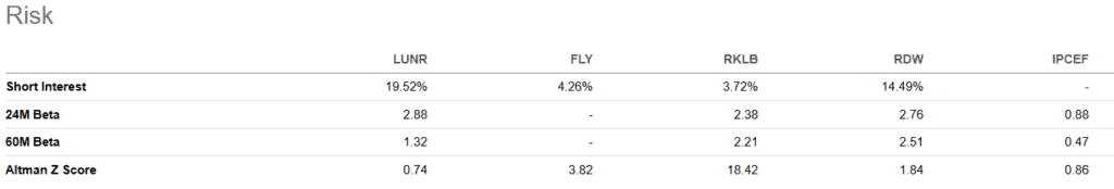 Vše se koneckonců projevuje i v riziku, a to nám ukazuje spekulativnost celého sektoru. U LUNR dosahuje Short interest 19,52 % a u Redwire 14,49 %, neboli že nezanedbatelná část trhu spekuluje na finanční nestabilitu. Tyto obavy souvisí s tím, jak firmy stále pálí hromadu hotovosti, ale také se skepsí kolem komercializace vesmíru.