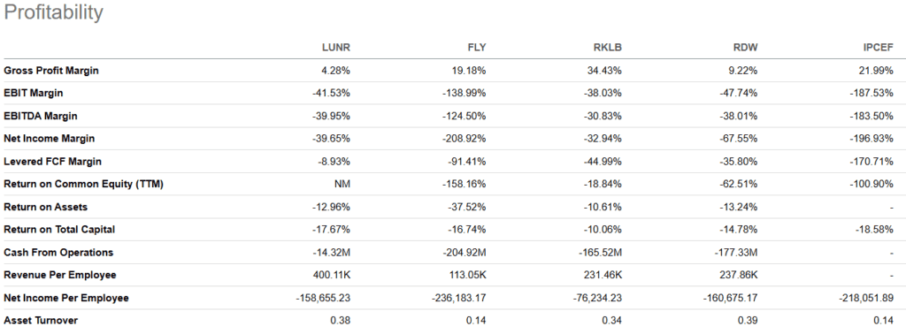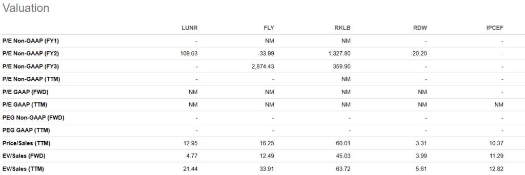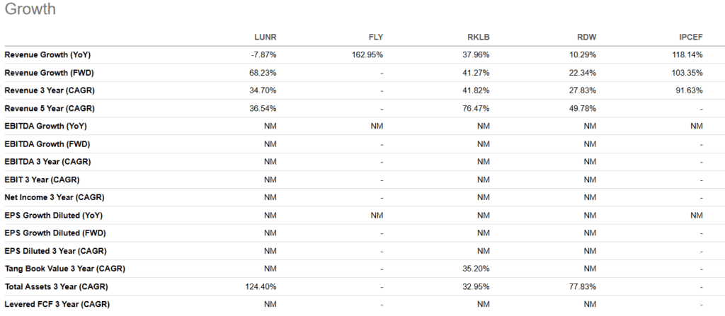LUNR vykázal meziroční pokles tržeb o 7,87 %, ovšem jeho budoucí výhled počítá s růstem o 68,23 %. Firefly dominuje aktuálnímu tempu růstu tržeb s hodnotou 162,95 %. Pětileté průměrné tempo růstu (CAGR) u RKLB dosahuje 76,47 %, u Redwire pak 49,78 %, což jsou excelentní čísla. Ukazatele zisku EBITDA a Net Income jsou u všech sledovaných subjektů v kategorii „NM“ (not meaningful), což odpovídá investiční fázi, ve které se celé odvětví nachází.