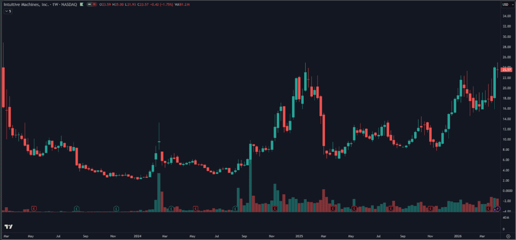 Akcie LUNR se aktuálně obchodují za 23,57 USD a z technického pohledu se nacházejí v mimořádně silné pozici těsně pod svými historickými maximy. Titul vykazuje vůči zbytku trhu značnou odolnost, což potvrzuje i roční zhodnocení přesahující 200 %. Aktuální cena se pohybuje prakticky na úrovni odhadované férové hodnoty (22,5), což znamená, že trh již do ceny započítal velkou část pozitivních očekávání.