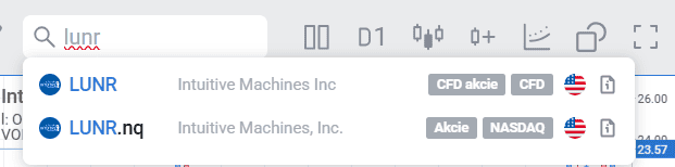 Po úspěšném dokončení prvního kroku se přesuňte do platformy StocksTrader. V levém horním rohu najdete vyhledávací pole, do kterého stačí zadat „LUNR“. Systém vám zobrazí několik možností.