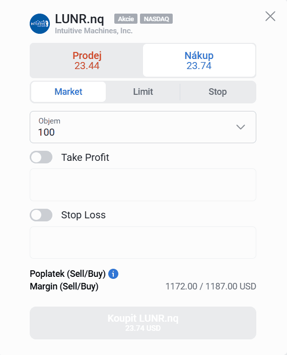Po výběru správné položky se dostanete do sekce, kde můžete akcie Intuitive Machines nakoupit během několika kliknutí. Na pravé straně obrazovky uvidíte modře označené různé typy příkazů. Pro začátečníky je nejjednodušší příkaz typu „market“, který během obchodních hodin umožňuje nákup za aktuální tržní cenu.