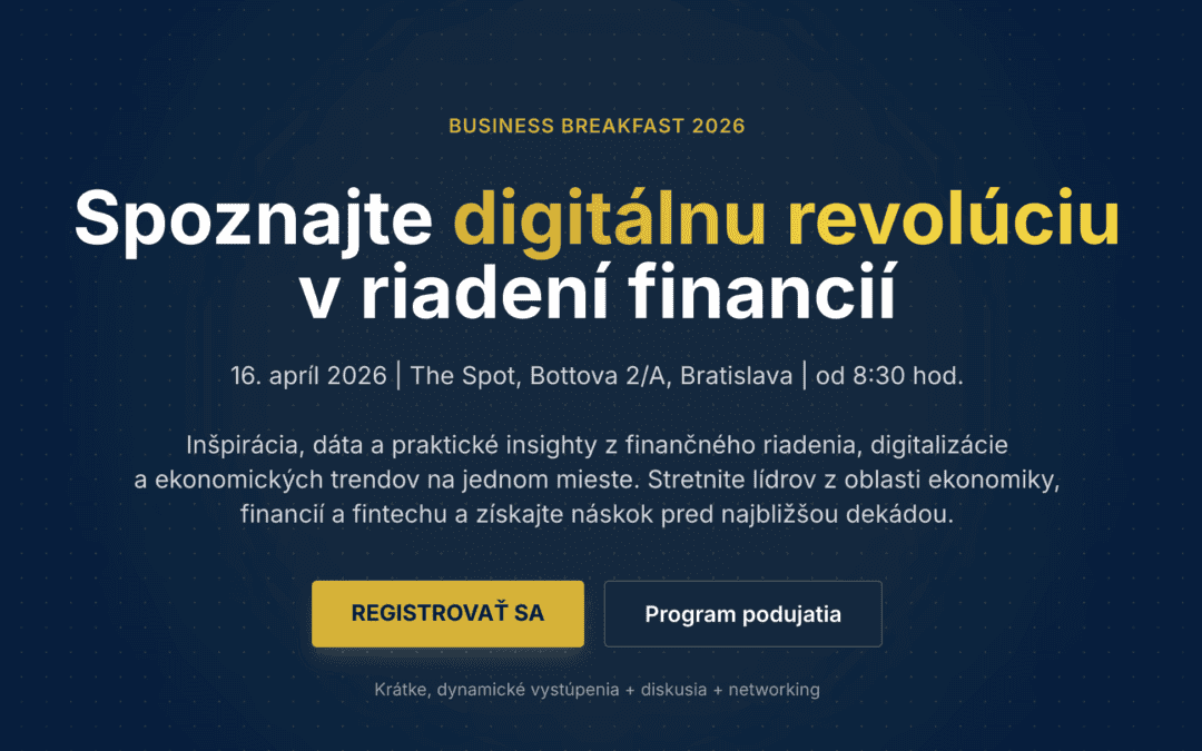 Slovenská asociácia finančníkov (SAF) za podpory partnerů Roger, Centire a Fitek organizuje SAF Business Breakfast, která se uskuteční 16. dubna 2026 od 8:30 hod. v prostorách The Spot v Bratislavě. Ústředním tématem je digitalizace v řízení firemních financí.