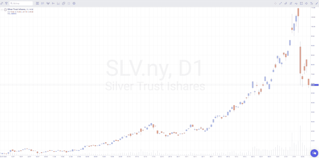 Ta přišla minulý pátek 30. ledna v podobě ranního oznámení, když Donald Trump nominoval na post šéfa Fedu Kevina Warshe. Tato zpráva okamžitě vypařila „prémii za chaos“, protože Warsh je vnímán jako zastánce tvrdé měny a nezávislosti centrální banky, což bleskově otočilo dosavadní tržní narativ. Během pár hodin se cena zlata propadla o 10 %, kdežto stříbro zažilo totální zhroucení až k úrovni 75 USD, přičemž fond SLV v jednu chvíli ztrácelo 35 %. Byli jsme svědky druhého největšího propadu stříbra za posledních 60 let, hned po tom, který proběhl o týden dříve.