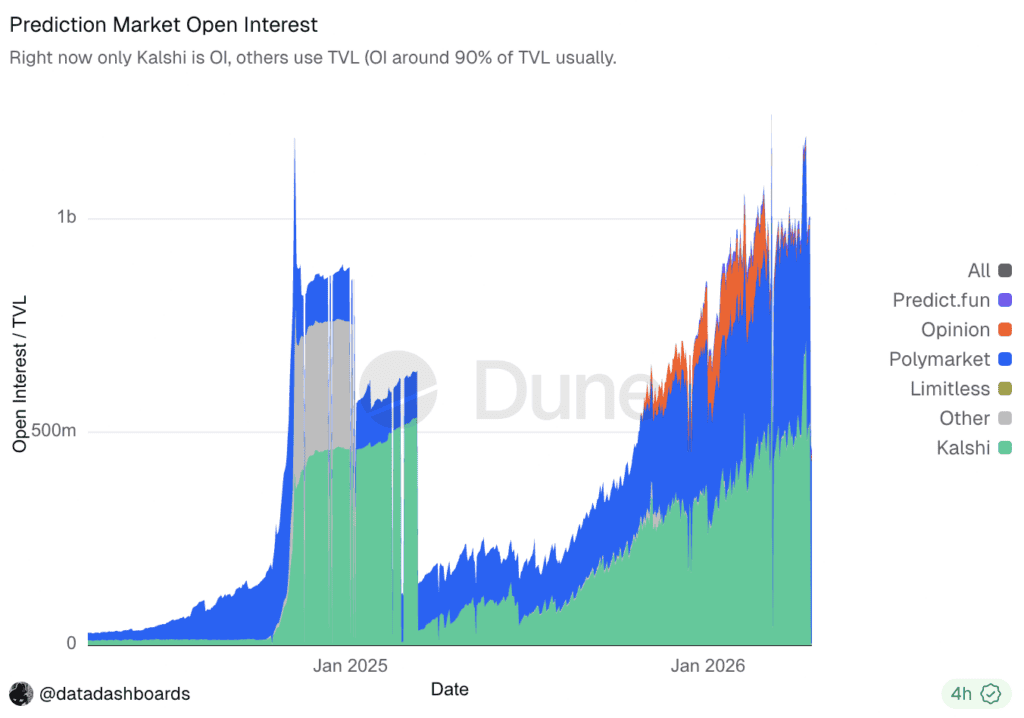 - Open Interest: hodnota kapitálu uzamčeného v aktivních sázkách – dosáhla v posledních dnech rekordních úrovní, přičemž Kalshi i Polymarket drží přiblížně stejný podíl kolem 500 milionů $. Růst celkového Open Interestu směrem přes hranici 1 miliardy $ potvrzuje, že uživatelé využívají tyto trhy pro dlouhodobý hedging spíše než jen pro krátkodobou spekulaci. Tento ukazatel je zásadní pro stabilitu ekosystému, protože demonstruje trvalou důvěru účastníků v konečné vypořádání událostí.
