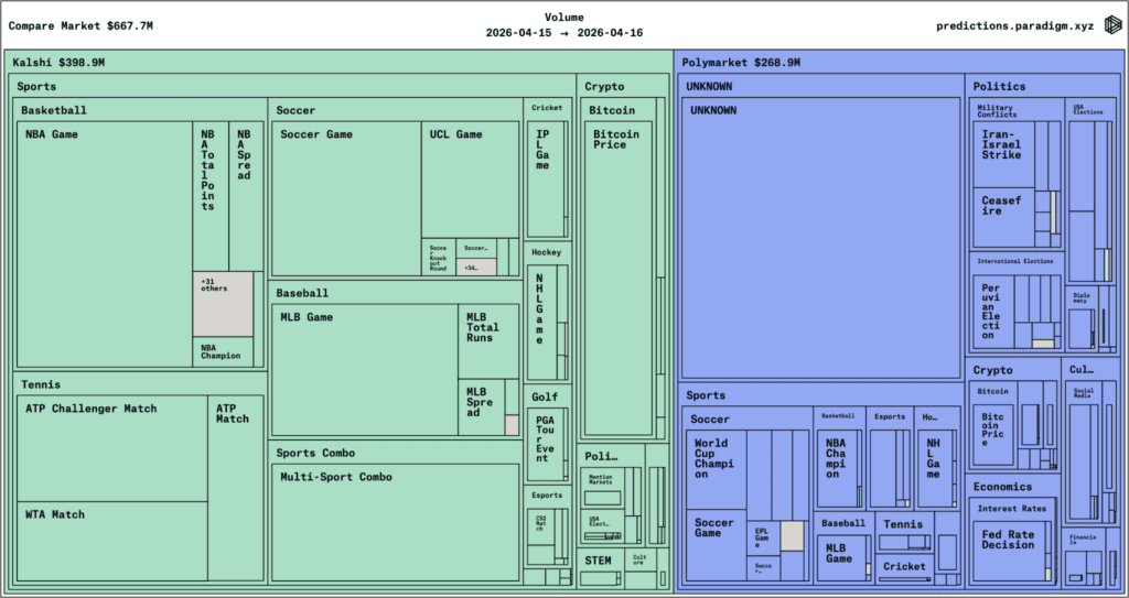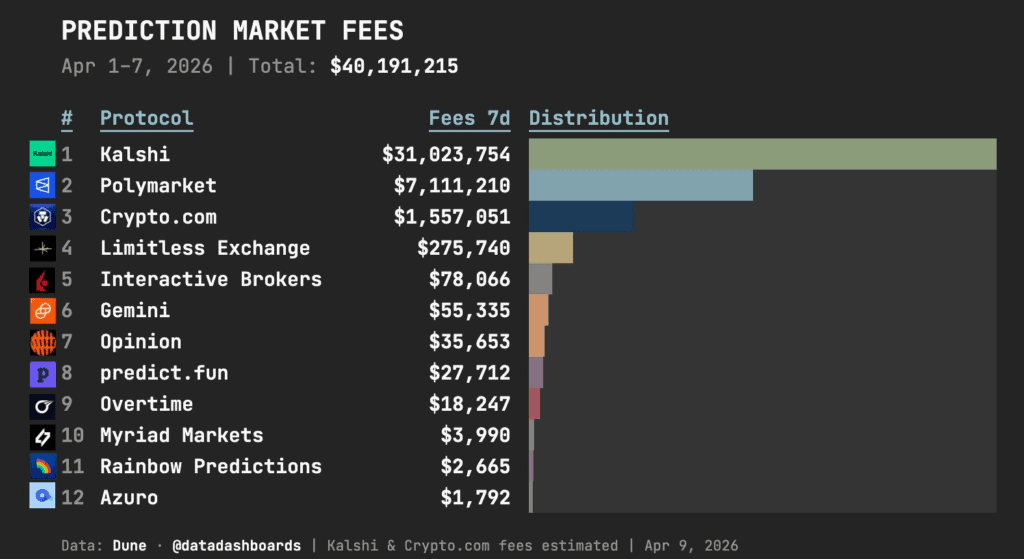 - Poplatky: Data za první týden v dubnu ukazují, že predikční trhy jsou již velmi výdělečným odvětvím s týdenním výnosem přes $40 milionů. Naprostým vítězem je Kalshi, který za pouhých 7 dní vygeneroval poplatky ve výši $31 milionů , což je dáno především institucionálním objemem. Polymarket s $7,1 miliony následuje jako druhý. Překvapením je třetí místo Crypto.com ($1,5 mil), které ukazuje, že tradiční krypto burzy začínají úspěšně monetizovat zájem svých uživatelů o predikční kontrakty. Ostatní platformy jako Limitless či Interactive Brokers zatím generují poplatky v řádech desítek až stovek tisíc dolarů.