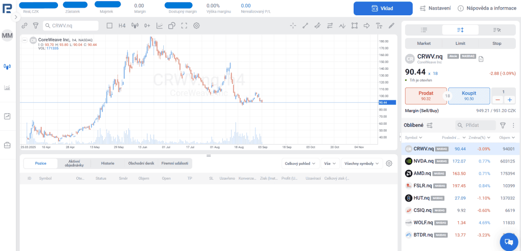 Po přihlášení je v centru pozornosti graf a přehled otevřených pozic. Pravý panel funguje jako watchlist a zároveň místo, odkud lze vyhledávat nové tituly a zadávat příkazy. Celé prostředí je velmi intuitivní – působí přirozeně i pro uživatele, kteří jsou zvyklí na robustní desktopové terminály.