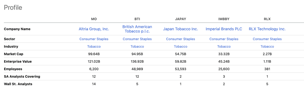 Do porovnání jsme vybrali několik světových tabákových společností. Altria je z nich z hlediska tržní kapitalizace největší, avšak těsně za ní se dotahuje British American Tobacco p. l. c. Zajímavé je, že má opravdu hodně menší počet zaměstnanců oproti svým konkurentům. Může to být zapříčeněno spoluprácí s PM International.